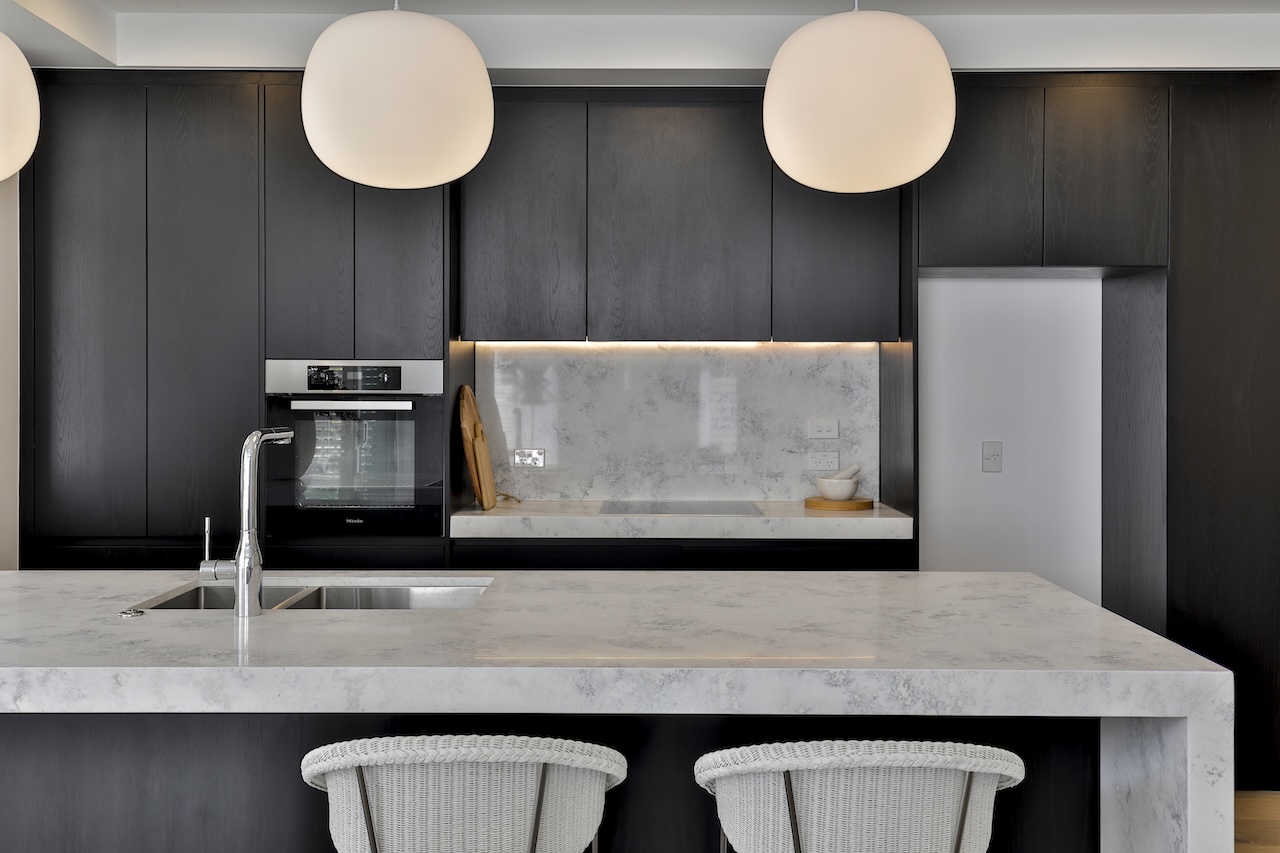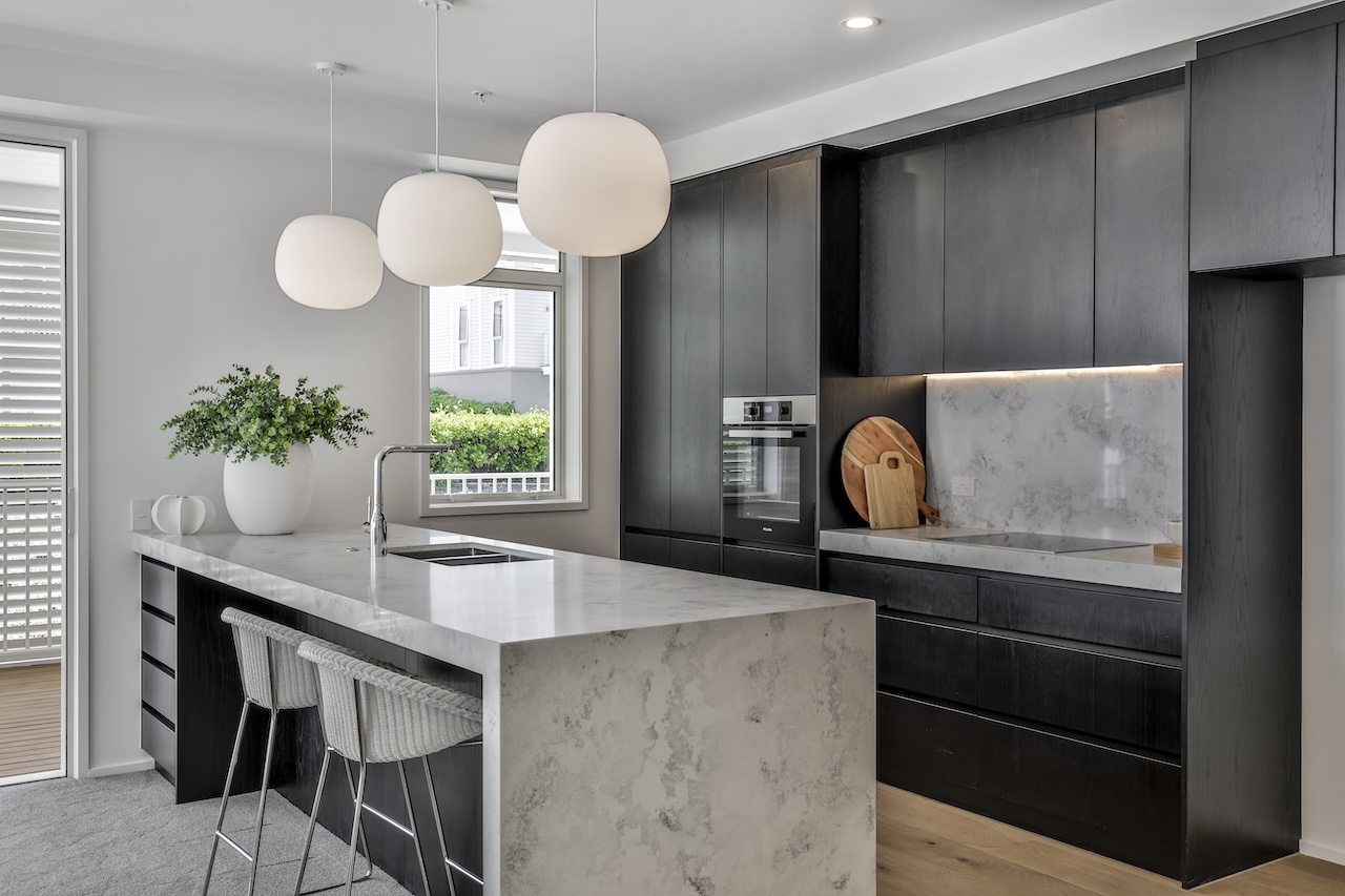 The kitchen forms the elegant centrepiece – finished in sleek black cabinetry and a striking stone benchtop, and features quality Miele appliances throughout. A separate laundry room and two large linen cupboards complete the home, offering exceptional practicality and storage.