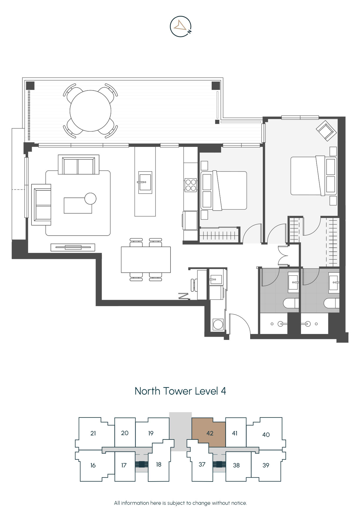From the moment you step through the separate entrance hall, you’ll appreciate the sense of scale and privacy this home affords. At one end, an expansive open-plan kitchen, living, and dining area is framed by floor-to-ceiling windows and sliding doors that open seamlessly to a generous entertainer’s balcony. At the other end, two luxurious bedrooms and bathrooms are thoughtfully positioned for complete separation – ideal for hosting guests or creating a private retreat of your own.